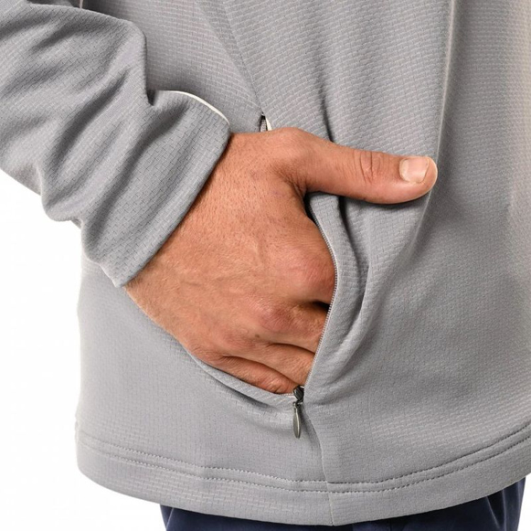 Tekstūruotas techninis vilnonis audinys Smailėjantis ledo ritulio kirpimas YKK užtrauktuku centre priekyje ir kišenės su kabyklos kilpa Kontrastingos baltos spalvos vamzdeliai Logotipai ant nugaros kaklo ir priekinio peties Austinė logotipo etiketė prie apačios.