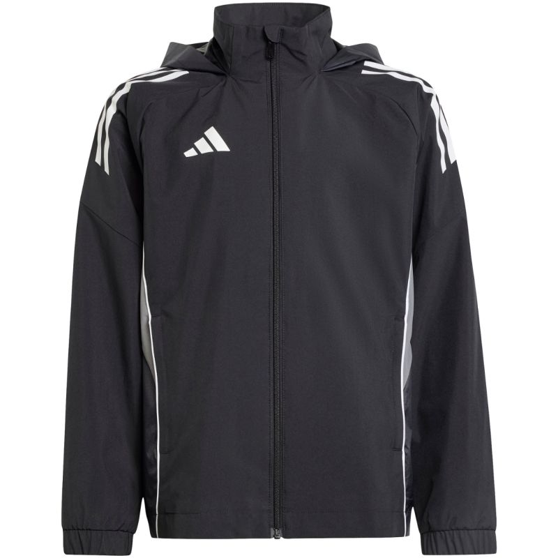 „adidas Tiro 25 Competition All Weather“ vaikiška striukė, juoda, IW0448. Ši „adidas Tiro“ vaikiška striukė puikiai tinka treniruotėms. Užtrauktukas per visą ilgį leidžia greitai apsirengti. Smakro apsauga saugo smakrą. Gobtuvas reguliuojamas sagtimis ir gali būti įkištas į apykaklę. Specifikacijos: Viršutinis audinys: 100 % perdirbtas poliesteris Vidinis audinys: 100 % termoplastinis poliuretanas Standartinis dydis Priekinės kišenės su užtrauktukais Tinklinis pamušalas Paslėptas gobtuvas Elastiniai rankogaliai
